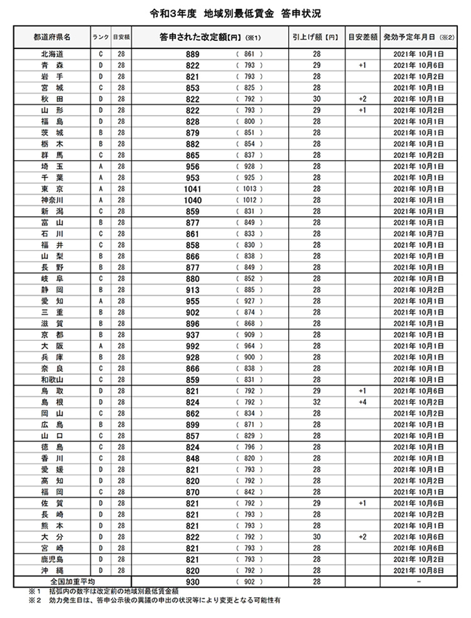 厚生労働省は、都道府県労働局に設置されている地方最低賃金審議会が答申した令和3年度の地域別最低賃金の改定額(以下「改定額」)を取りまとめました。これは、7月16日に厚生労働大臣の諮問機関である中央最低賃金審議会が示した「令和3年度地域別最低賃金額改定の目安について」などを参考として、各地方最低賃金審議会で調査・審議した結果を取りまとめたものです。答申された改定額は、都道府県労働局での関係労使からの異議申出に関する手続を経た上で、都道府県労働局長の決定により、10月1日から10月上旬までの間に順次発効される予定です。改定額及び発効予定年月日は下記のとおりです。