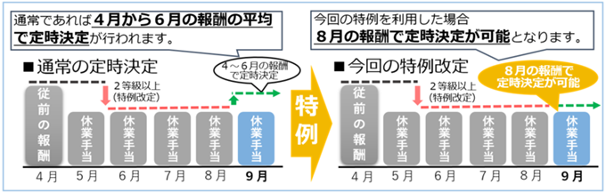 令和2年4月から令和3年7月までの間に新型コロナウイルス感染症の影響による休業により著しく報酬が下がった方について、事業主からの届出により、健康保険・厚生年金保険料の標準報酬月額を、通常の随時改定(4か月目に改定)によらず、特例により翌月から改定を可能とする措置が講じられているところです。