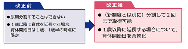 育児休業(1の休業を除く。)について、分割して2回まで取得することを可能とする。