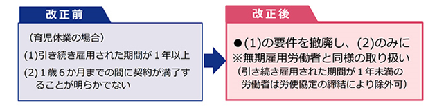 有期雇用労働者の育児休業及び介護休業の取得要件のうち「事業主に引き続き雇用された期間が1年以上である者」であることという要件を廃止する。ただし、労使協定を締結した場合には、無期雇用労働者と同様に、事業主に引き続き雇用された期間が1年未満である労働者を対象から除外することを可能とする。