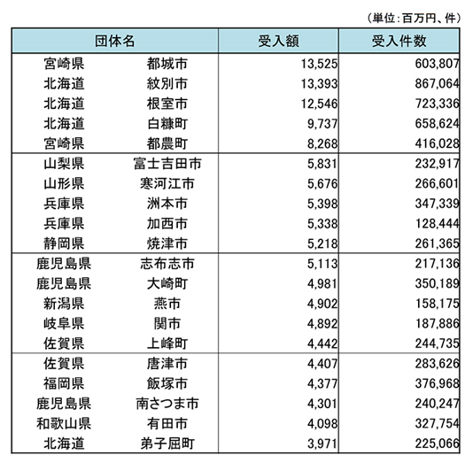 市区町村別での寄附額をみると、宮崎県都城市が135億2500万円で4年ぶりのトップとなり、以下、「北海道紋別市」133億9300万円、「同根室市」125億4600万円、「同白糠町」93億3700万円と北海道が2位から4位までを占めています。