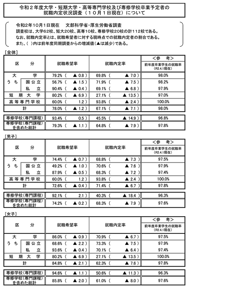 厚生労働省と文部科学省では、令和3年3月大学等卒業予定者の就職内定状況を共同で調査し、令和2年10月1日現在の状況を取りまとめ、大学生の就職内定率は69.8%(前年同期比7.0ポイント低下)となりました。