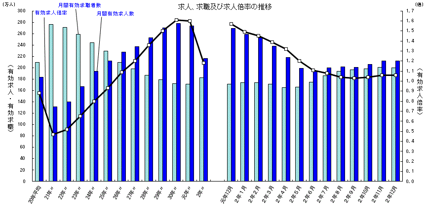 厚生労働省から、令和2年12月分及び令和2年分の有効求人倍率等が公表されています。厚生労働省では、公共職業安定所(ハローワーク)における求人、