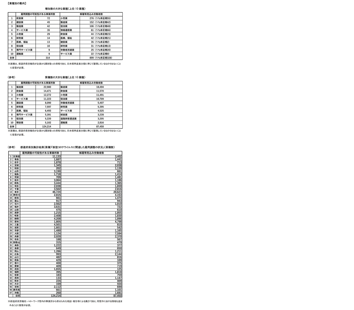 なお、本情報は、都道府県労働局等が把握できた範囲のものであり、必ずしも網羅性のあるものではないこと、また、過去に把握した情報の一部には既に再就職をされた方も含まれている可能性があることから、累計値ではなく、週次で新たに把握された数値の動向を注視していくことが適当であるとされています。