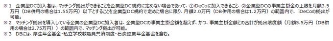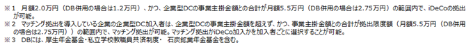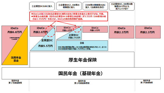 現在は、企業型確定拠出年金(以下「企業型DC」)については、他制度(確定給付企業年金(以下「DB」)、私立学校教職員共済制度及び石炭鉱業年金基金をいう。以下同じ。)に加入している場合には、他制度の掛金の額の実態等にかかわらず、月額の拠出限度額を一律に2.75万円に引き下げる(他制度に加入していない場合は5.5万円)こととしています。