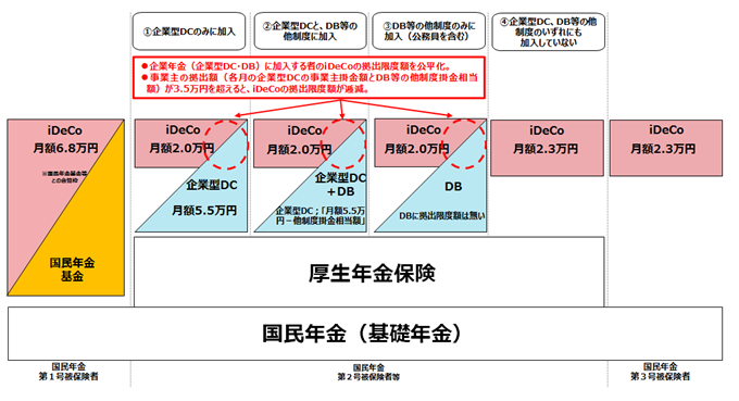 また、現在は、加入する他制度又は共済組合によって個人型DCの拠出限度額の上限が月額2万円又は1.2万円という差が生じていますが、これを2万円に統一することとされました。