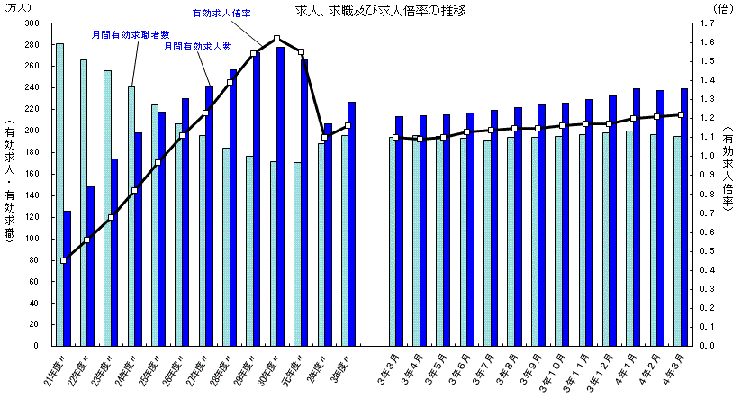 厚生労働省では、公共職業安定所(ハローワーク)における求人、求職、就職の状況をとりまとめ、求人倍率などの指標を作成し、一般職業紹介状況として毎月公表しており、令和4年3月分及び令和3年度分の一般職業紹介状況が公表されました。また、総務省から、同月分・同年度分などの労働力調査の結果が公表されました。これらにより、有効求人倍率と完全失業率が明らかにされています。